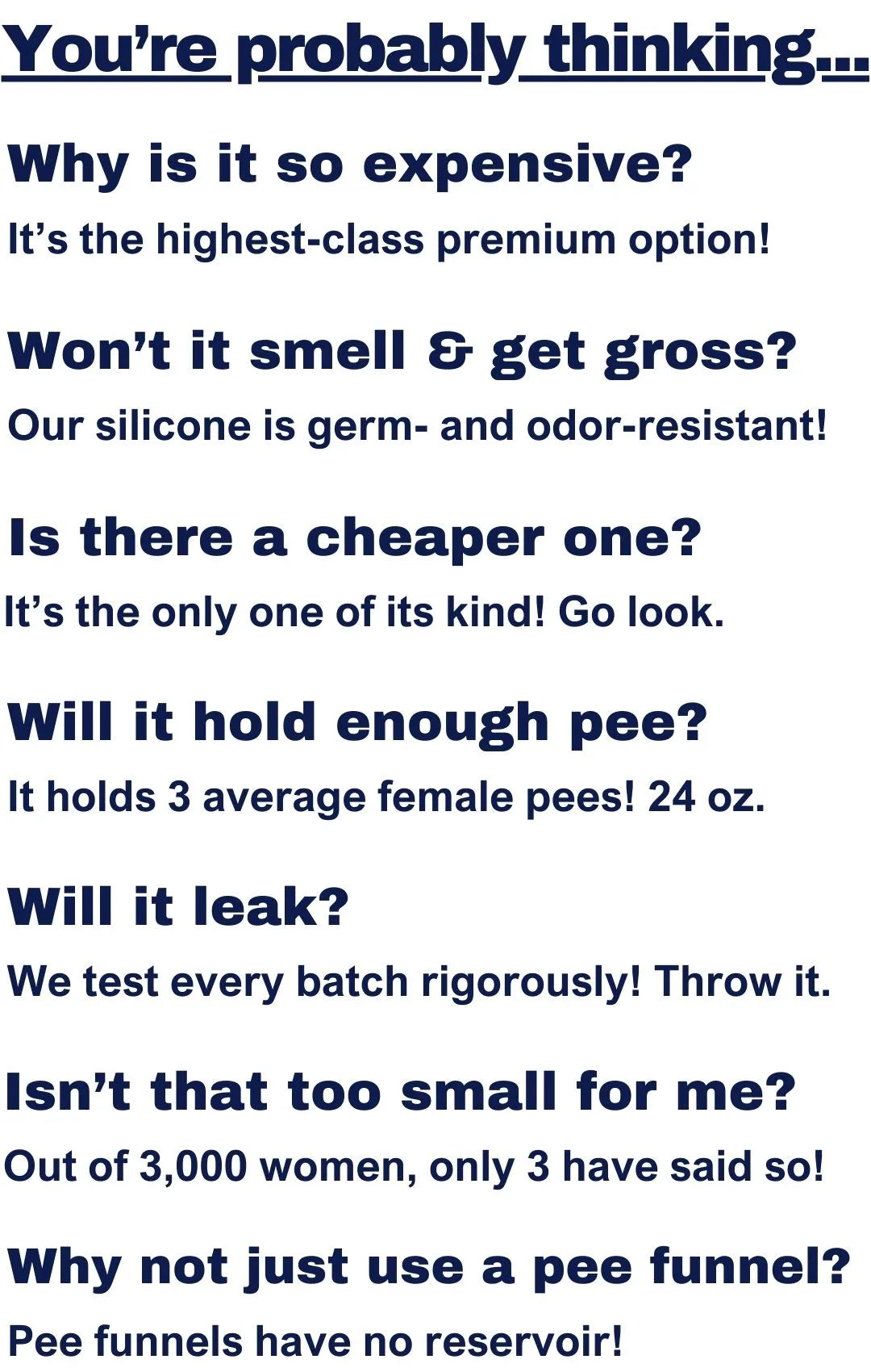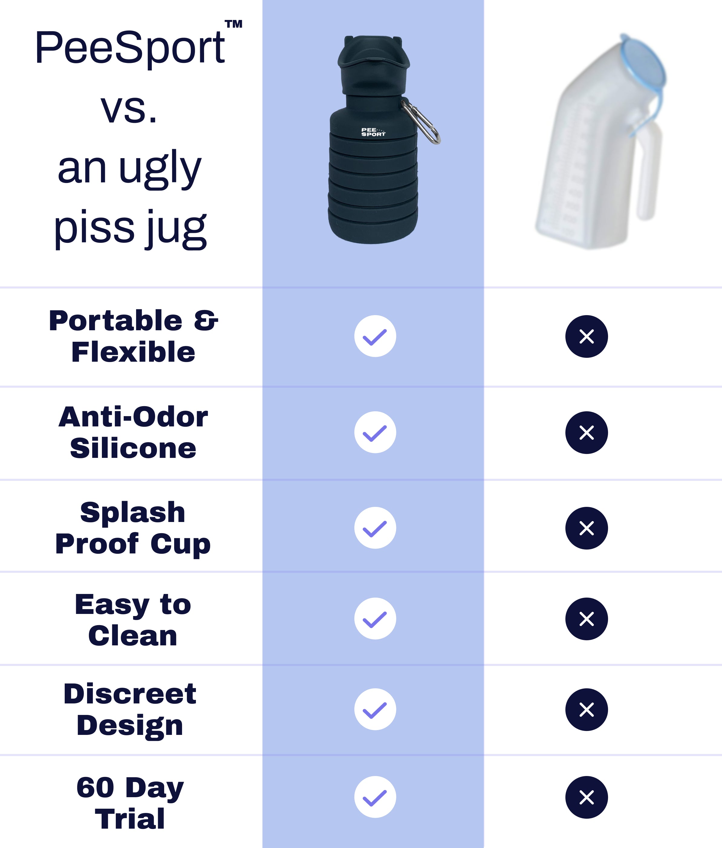 We chose the highest-grade, degradation-resistant, odor-free silicone we could. Unlike the cheap hospital-looking pee bottles online, you'll only need to buy PeeSport once.