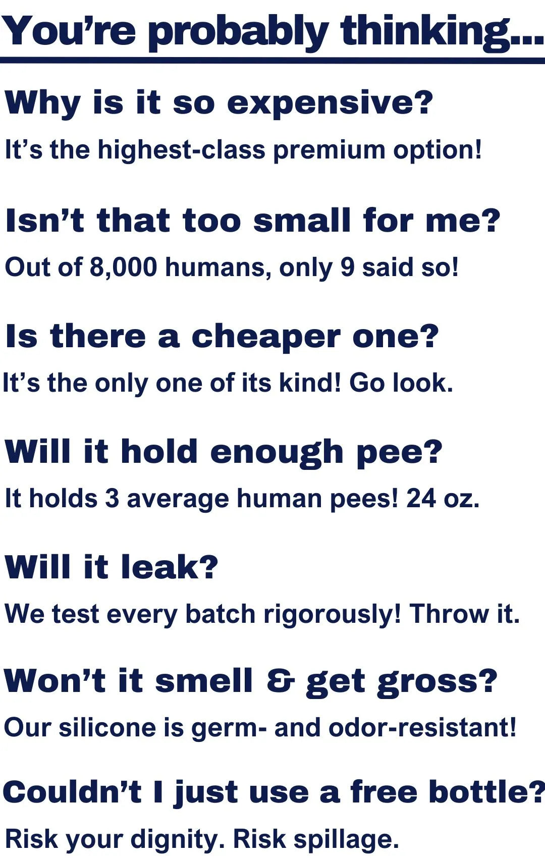 Sure, PeeSport is NOT for everyone. You may be happy peeing in a cheap, smelly, plastic bottle that you need to hide. If you want to risk smells and embarrassing situations, be our guest!